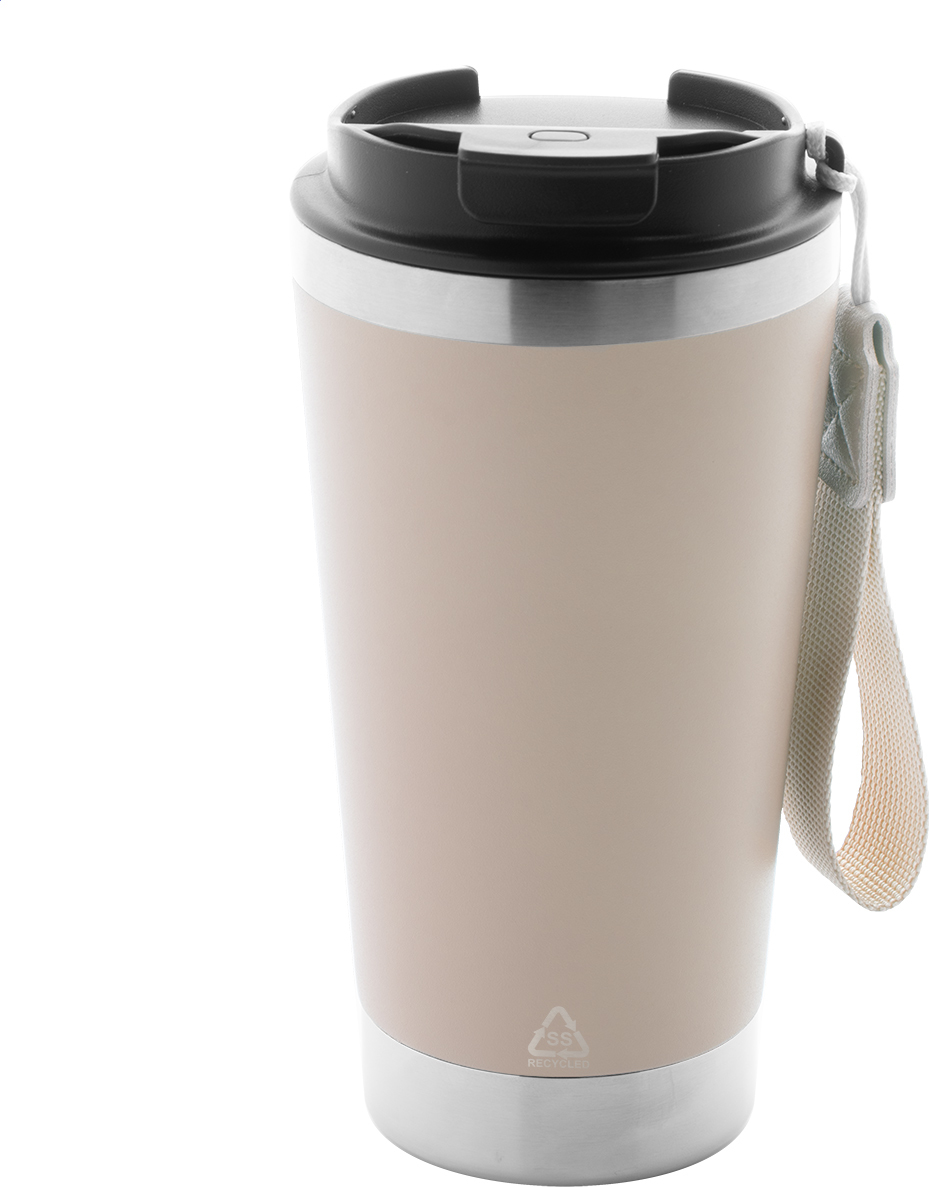 Dvoustěnný termo hrnek z recyklované nerezové oceli s víčkem na pití z PP a páskem na přenášení v odpovídající barvě. 430 ml.