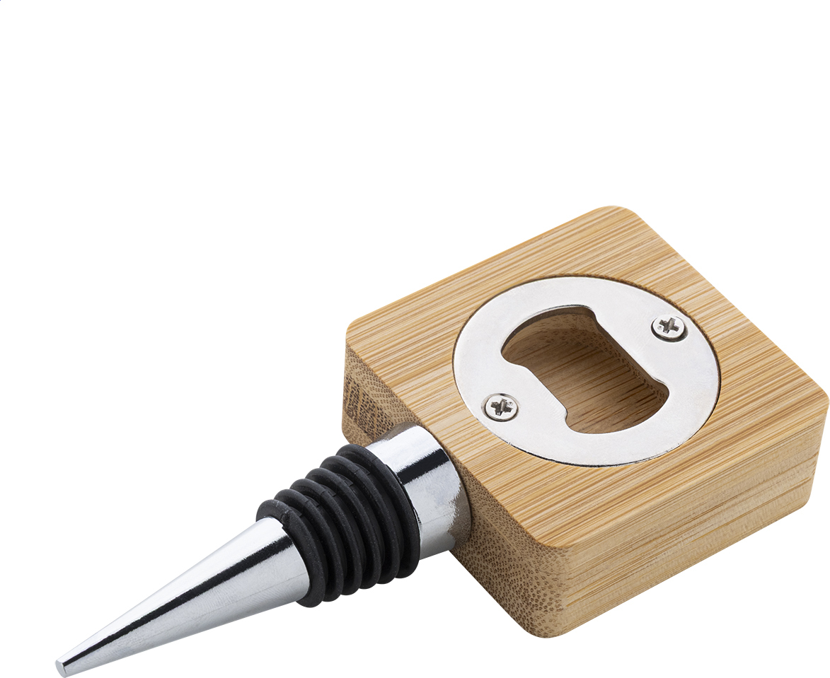 Kovová zátka na víno s čtvercovým bambusovým otvírákem na lahve.