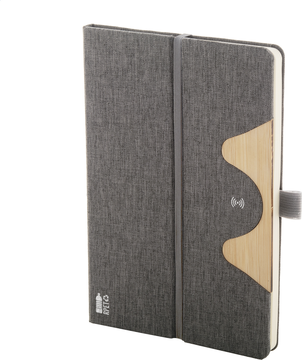 Blok A5 potažený polyesterem RPET s bambusovou vložkou, funkcí stojánku na mobil a vestavěnou bezdrátovou rychlonabíječkou (15W). S 80 linkovanými listy z recyklovaného papíru. Včetně USB nabíjecího kabelu.