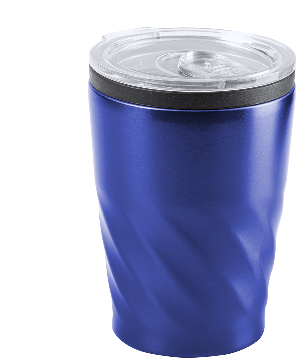 Nerezový, jednostěnný termo hrnek s plastovým víčkem na pití, 350 ml.