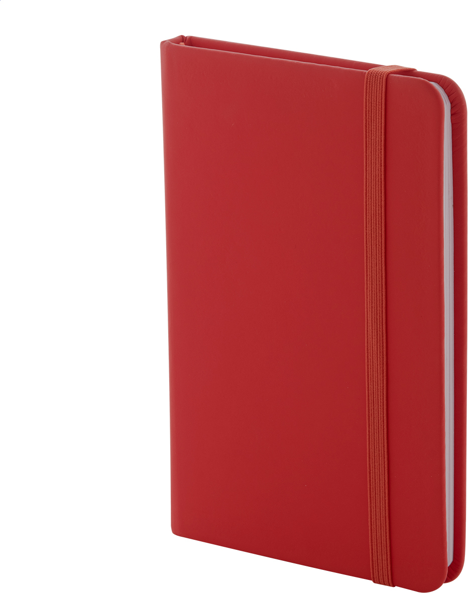 Blok A6 z recyklované PU kůže se 100 čistými listy z recyklovaného papíru. Se záložkou v odpovídající barvě a gumičkou.