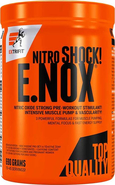 ! Obsahuje kofein, není vhodné pro děti a těhotné ženy. Denní dávka (15,3–46 g) obsahuje 73–220 mg kofeinu. Produkt není vhodný pro osoby trpící přecitlivělostí na kofein.PUMPING MATRIX NOVĚ OBOHACEN O KRYSTALICKÝ L-CITRULIN VE VOLNÉ FORMĚ PRO JEŠTĚ VĚTŠÍ ÚČINEK!Představujeme totálně nabušené "NÓčko" s nejlepším poměrem cena/výkon! Zástupce nejmodernější generace produktů na bázi NO, tři speciální formule účinných látek v ohromujícím množství a oblíbený suplement našeho úspěšného kulturisty Slavoje Bednáře – to jsou hlavní důvody, proč byste E.NOX® Shock rozhodně neměli přehlédnout!PUMPING 4! MATRIXPosuňte své hranice žilnatosti a napumpování s PUMPING 4! MATRIX! Tato jedinečná formule obsahuje neuvěřitelných 10 030 mg* účinných látek. Se 4 000 mg argininu AKG 2 000 mg čistého argininu – kombinací ověřenou mezi elitními sportovci – efektivně podpoříte tvorbu oxidu dusnatého (NO). Přidejte k tomu 2 000 mg citrulinu DL-malátu a 1 000 mg volného citrulinu (free form) a získáte silný arzenál pro překonání svých tréninkových limitů!ENERGY & MENTAL FOCUS 5! MATRIXCelkem 11 500 mg* účinných látek dodávajících energii, fokus a maximální svalovou výdrž! E.NOX® Shock obsahuje 5 000 mg kreatinu monohydrátu – nejověřenější a nejúčinnější kreatinové formy, která existuje. Společně se 4 000 mg beta-alaninu se dostanete v každé náročné sérii až na samotný vrchol svalové výdrže!Po náročném dni oceníte také 2 500 mg stimulačních látek: taurin, kofein a extrakt ze zeleného čaje jako zdroj přírodního kofeinu. E.NOX® Shock – to je synonymum pro maximální nasazení a totální koncentraci!CARBO MATRIXPro účinek výrobku E.NOX® Shock je důležitá také jeho sacharidová složka – tvoří ji 3 000 mg značkové isomaltulózy (Palatinose™). Palatinóza je výborným zdrojem energie pro sportovce a osoby při zvýšené tělesné zátěži. Palatinózu doplňuje 3 500 mg oblíbeného maltodextrinu a 10 000 mg dextrózy monohydrát jako rychlý zdroj energie. Tato kombinace sacharidů v celkovém množství 16 500 mg* Vám zajistí dostatek energie v průběhu celého výkonu a zároveň maximalizuje účinek energetické formule E.NOX® Shock.* v nejvyšší denní dávce (3 odměrky)Porovnání E.NOX® Shock s ostatními anabolizéry Extrifit:E.NOX® Shock je nejlepším NO produktem z pohledu ceny a výkonu.Základní "NÓčko" s vysokým zastoupením tzv. "nakopávačů", které zajistí velmi citelné zacloumání a kopanec do tréninku.Účinný PUMPING 4! MATRIX pro efektivní stimulaci NO (oxidu dusnatého), který je zodpovědný za napumpování svalů.Vysoká dávka ENERGY & MENTAL FOCUS formule zajistí velký příval energie a maximální výdrž i pro ty nejnáročnější tréninky.Sacharidová směs je tvořena trojicí dextróza – maltodextrin – palatinóza. Tato trojka má výborný postupný účinek a plynulé zásobení energií.Výhodou je nízká cena za skutečně velmi působivý efekt napumpování!Jedná se o doplněk stravy.Dávkovánízačátečníci 1 odměrku (15,3 g), kondiční sportovci 2 odměrky (30,6 g), výkonnostní a profesionální sportovci 3 odměrky (46 g)na každou odměrku (15,3 g) použijte 150 ml vodyužívejte 15–20 minut před tréninkemobsah připraveného nápoje je určen k okamžité konzumacimaximální denní dávka = 46 g.HodnotyVýživové údaje: 100 g1 odměrka (15,3g)2 odměrky (30,6g)3 odměrky (46 g)Energetická hodnota 1 283 kJ / 305 kcal 196 kJ / 47 kcal 393 kJ / 94 kcal 590 kJ / 141 kcalTuky 0,5 g 0,1 g 0,2 g 0,2 g- nasycené mastné kyseliny 0 g 0 g 0 g 0 gSacharidy 36 g 5,6 g 11 g 17 g- cukry 28 g 4,3 g 8,6 g 13 gVláknina 0,8 g 0,1 g 0,2 g 0,4 gBílkoviny 0 g 0 g 0 g 0 gSůl 0,03 g < 0,01 g < 0,01 g < 0,01 gObsah účinných látek: 1 odměrka (15,3g) 2 odměrky (30,6g) 3 odměrky (46 g)PUMPING 4! MATRIX 3 343 mg 6 687 mg 10 030 mgL-arginin AKG- z toho L-arginin*1 333 mg833 mg2 667 mg1 667 mg4 000 mg2 500 mgL-arginin báze* 667 mg 1 333 mg 2 000 mgL-citrulin DL-malát- z toho L-citrulin*1 010 mg667 mg2 020 mg1 333 mg3 030 mg2 000 mgL-citrulin FREE FORM* 333 mg 667 mg 1 000 mgENERGY & MENTAL FOCUS 5! MATRIX 3 833 mg 7 667 mg 11 500 mgKreatin monohydrát 1 667 mg 3 333 mg 5 000 mgBeta-alanin* 1 333 mg 2 667 mg 4 000 mgTaurin* 667 mg 1 333 mg 2 000 mgExtrakt ze zeleného čaje- z toho přírodní kofein 30 %133 mg40 mg267 mg80 mg400 mg120 mgKofein bezvodý 33 mg 67 mg 100 mgCARBO MATRIX5 500 mg 11 000 mg 16 500 mgPalatinose™ (izomaltulóza) 1 000 mg 2 000 mg 3 000 mgMaltodextrin 1 167 mg 2 333 mg 3 500 mgDextróza monohydrát 3 333 mg 6 667 mg 10 000 mgCELKOVÝ OBSAH KOFEINU73 mg 147 mg 220 mgCELKOVÝ OBSAH AMINOKYSELIN 4 500 mg 9 000 mg 13 500 mgCELKOVÝ OBSAH LÁTEK12 677 mg 25 353 mg 38 030 mgSloženíPlatí pro všechny příchutědextróza monohydrát, kreatin monohydrát, beta-alanin, L-arginin alfa-ketoglutarát 2 : 1, maltodextrin, Palatinose™ (izomaltulóza+), protispékavé látky: fosforečnan vápenatý a oxid křemičitý, L-citrulin DL-malát 2 : 1, regulátor kyselosti: kyselina citronová, L-arginin báze, taurin, přírodní barvivo: beta karoten (pro příchuť pomeranč) / červená řepa (pro příchutě višeň a černý rybíz) / chlorofylin (pro příchuť zelené jablko), L-citrulin, extrakt ze zeleného čaje (30 % přírodního kofeinu), kofein bezvodý, aroma, sladidla: sukralóza a steviol-glykosidy přírodního původu (z rostliny stévie)UpozorněníDoplněk stravy – vhodné zejména pro sportovce. Se sladidly. Obsahuje kofein – není vhodné pro děti a těhotné ženy (73–220 mg kofeinu v denní dávce). Skladujte v suchu při teplotě do 25 °C, pečlivě uzavřené, chraňte před přímým slunečním zářením a mrazem. Po prvním otevření spotřebujte do 3 měsíců a uchovávejte v suchém prostředí, pečl