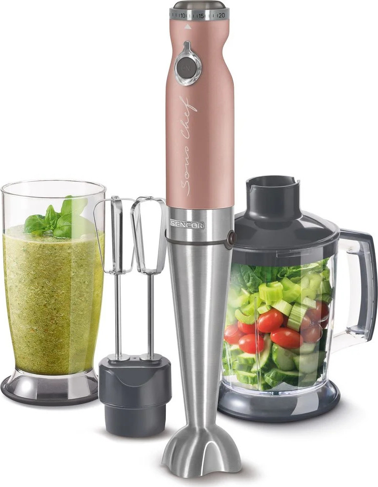 Tyčový mixér je jedním z nejvíce využívaných přístrojů v kuchyni. Pomůže vám s přípravou krémových polévek, omáček, dětské stravy a dalších pokrmů. Mixér Sencor 4 v 1 vám nabízí několik funkcí v jednom výrobku. Kromě mixování rozšiřuje možnosti o sekání i šlehání a ušetří tak místo v kuchyni. Poradí si s každou potravinouTyčový mixér s technologií Titanium QuadBlade je vybaven 4 ostrými čepelemi s titanovým povrchem a v kombinaci se silným motorem si se zpracováním potravin snadno poradí. Na těle tyčového mixéru najdete LED podsvícený hlavní vypínač, tlačítko pro uvolnění nástavců a závěsné očko. Obě nádoby mají praktickou protiskluzovou podložku pro maximální stabilitu na pracovní ploše.Záruka 6 let na motorTechnologie TITANIUM QuadBladePříkon 1 200 WExtra tichý DC motorPlynulá regulace rychlosti (20 rychlostí)Ergonomicky tvarovaná rukojeťNerezový nástavec použitelný i pro mixování horkých pokrmůNerezová sekací čepelPříslušenství800 ml mixovací nádobka s víčkemNerezový dvoumetlový šlehací nástavecSekáček o objemu 1 250 ml s nerezovými nožiTlačítka pro uvolnění odnímatelného nástavceZávěsné očkoDélka přívodního kabelu: 1,2 m