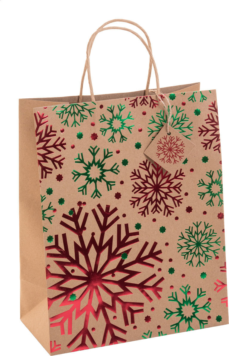 Dárková taška z recyklovaného kraftového papíru s vánočním designem vyraženým fólií, kroucenými uchy a dárkovou visačkou. 140 g/m².