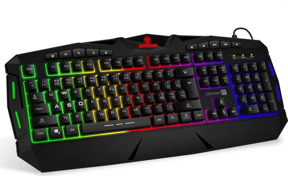 Klávesnice BIOHAZARDProfesionální gamingová klávesnice BIOHAZARD series pro hráče počítačových her v českém a slovenském layoutu s barevným rainbow podsvícení a pětistupňovou regulací intenzity podsvícení. K dispozici je 10 multimediálních kláves.Určena pro profesionální i amatérské hráče počítačových herCZ + SK verzeBarevné RAINBOW podsvícení5 stupňová regulace intenzity podsvíceníMožnost úplného vypnutí podsvícení10 multimediálních kláves:- webový prohlížeč- e-mailový klient- vyhledávání- tento počítač- kalkulačka- předchozí stopa- další stopa- přehrát/pauza- hlasitost (+)- hlasitost (-)Win-Lock (uzamčení Windows klávesy při hraní her bránící nechtěné vyvolání nabídky Windows)Klasické rozložení kláves19 Anti-ghost kláves zabraňující chybné interpretaci více stisknutých kláves najednouSnadná instalace Plug & Play bez nutnosti stahování ovladačů a bez nutnosti instalace softwareKompatibiliní s operačními systémy Windows XP/Vista/7/8/10/ a Mac OS X (funkce produktu, které nejsou podporovány Mac OS X, nemusí fungovat správně)Délka přívodního kabelu: 180 cmRozměry (d × h × v): 490 x 220 x 40 mmHmotnost včetně kabelu: 770 gBalení obsahuje:KlávesniceNávod k obsluze