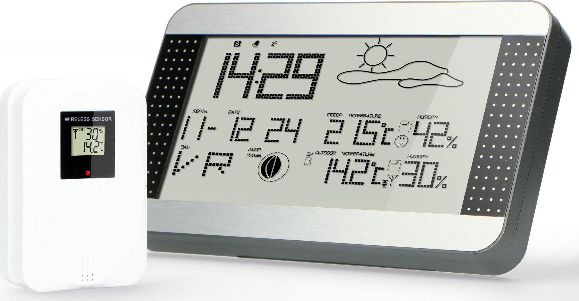 Meteostanice s bezdrátovým senzorem, stříbrnáPomocí této meteostanice můžete předpovídat počasí ve vašem okolí. Přístroj je schopen měřit všechny druhy klimatologických aspektů. Sledování vývoje počasí se může stát zábavným tématem nejen pro vás, ale i pro vaše děti, a to všech věkových kategorií. WS-1700 díky svým pokročilým funkcím nabízí plno informací, na které se můžete spolehnout. Technické parametry:snadno čitelný displej 7,7” / 19,6 cmbezdrátový venkovní senzorvybaveno senzory pro zaznamenání teploty (vnitřní a venkovní), vlhkost (vnitřní a venkovní)animovaná předpověď počasí poskytuje jednoduchý a rychlý přehled informací o počasípaměť nejnižší a nejvyšší naměřené hodnoty (24 hodin)indikace fáze měsícezobrazuje datum a časbudík s odložením buzeníindikátor stavu bateriedosah venkovní jednotky až 50 mlze umístit na rovný povrch nebo na zeďprovoz obou jednotek na baterie (vnitřní jednotka 2xAA 1,5V, venkovní jednotka 2xAA 1,5V)součástí balení: vnitřní jednotka, bezdrátový venkovní senzorrozměry: vnitřní jednotka: 22,1 x 2,7 x 13,2 cm (šxhxv)