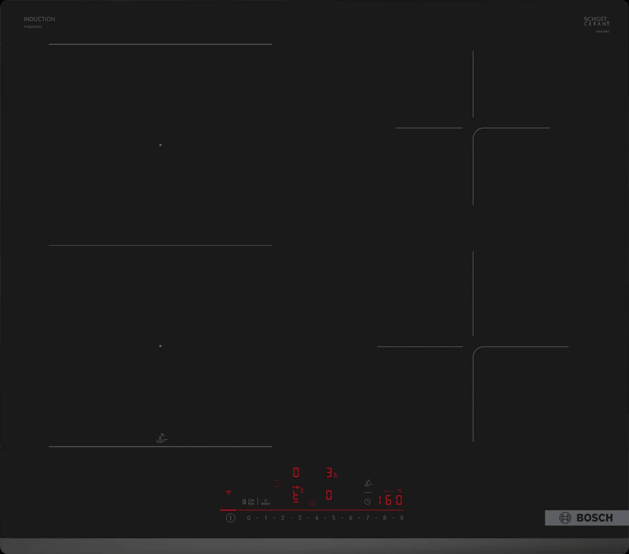 Indukční varná deska Bosch PVS63KHC1E v černé barvě bez rámečku je široká 60 cm. Nabízí 4 samostatné varné zóny se 17 stupni výkonu. Její součástí je také flexibilní varná zóna, která usnadňuje vaření ve větších hrncích. Senzorové ovládání usnadňuje její používání. Disponuje funkcemi Perfect Fry Plus, PowerBoost, PanBoost, Pause, Restart, dětskou pojistkou, časovačem a dalšími praktickými funkcemi. Funkce Smart Hood Automatic umožňuje automatické přizpůsobení odsavače par nastavení varné desky. Varná deska umožňuje dálkové ovládání díky WiFi připojení a aplikaci HomeConnect.Snadné ovládáníVarná deska Bosch s intuitivním ovládacím panelem DirectSelect+ a podpůrnou světelnou lištou umožňuje snadný výběr varných zón a nastavení požadovaného výkonu. S touto varnou deskou můžete vše nastavit přímo a rychle díky pohodlnému ovládání.Funkce CombiZoneFunkce CombiZone umožňuje spojit dvě varné zóny do jedné větší, čímž získáte více prostoru a flexibility pro ohřev velkých pokrmů. Tuto funkci oceníte při vaření nadměrných nádob.PerfectFry PlusSenzor PerfectFry Plus zobrazuje a nepřetržitě monitoruje teplotu pánve, čímž zabraňuje připalování. Můžete si vybrat z 11 dostupných teplot v rozmezí od 70 °C do 220 °C, což zajistí vždy bezchybné výsledky.Připojení varné desky k odsavači parPo připojení k účtu Home Connect může být odsavač par automaticky ovládán varnou deskou. To je založeno na algoritmu, který upravuje výkon odsavače na základě nastavení varné desky. Vaše kuchyně bude bez nepříjemných pachů a výparů a už nikdy nebudete muset čistit otisky prstů na odsavači par. Osvojte si nový a jednoduchý způsob vaření.Oblíbené tlačítkoVytvořte si dokonalou kombinaci nastavení pomocí tlačítka Oblíbené. Připojte varnou desku ke svému účtu Home Connect a získejte kontrolu nad výkonem, časovačem nebo osvětlením odsavače.Dálková diagnostikaPokud vaše domácí spotřebiče nefungují tak, jak by měly, pomůže vám vzdálená diagnostika. Stačí zavolat na Home Connect a domluvit si schůzku pro vzdálenou diagnostiku připojeného spotřebiče přes internet. Zákaznický servis Bosch na dálku prověří váš spotřebič, lokalizuje problém a poskytne vám přesné pokyny. Pokud se problém nepodaří vyřešit tímto způsobem, můžete kontaktovat servisního technika.Varné zónyCombiZone: umožňuje používat větší varné nádobí spojením dvou běžných varných zón do jedné velké zóny.Přední levá zadní zóna: 190 mm, 210 mm, 2,5 kW (max. výkon 3,7 kW).Levá zadní varná zóna: 190 mm, 210 mm, 2,5 kW (max. výkon 3,7 kW)pravá zadní varná zóna: 145 mm, 1,6 kW (max. výkon 2,2 kW)pravá přední varná zóna: 180 mm, 2 kW (max. výkon 3,1 kW)