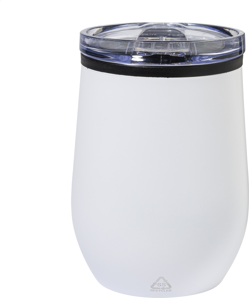 Dvoustěnný termo hrnek z recyklované nerezové oceli s vnitřní stranou z PP a víčkem z PS. 350 ml.