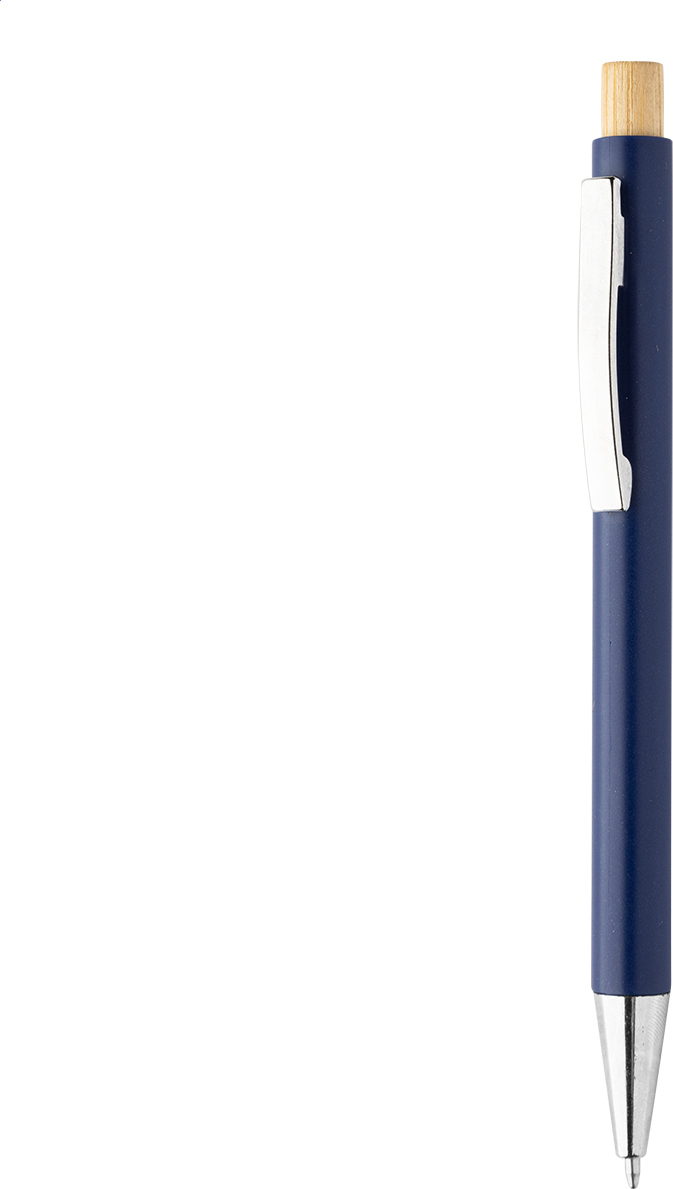 Kuličkové pero z recyklovaného ABS plastu s bambusovým tlačítkem a kovovým klipem. S modrou náplní.