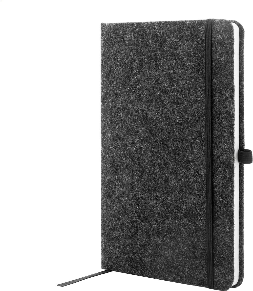 Blok A5 potažený plstí RPET s 80 linkovanými listy z recyklovaného papíru. Se záložkou, gumovým páskem a držákem na pero.