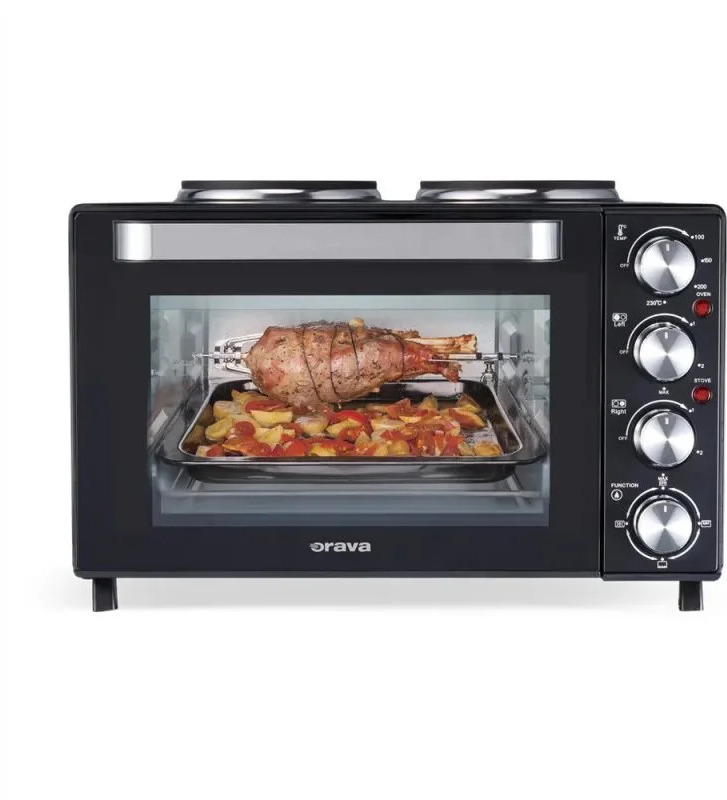 Elektrická trouba Orava Elektra-X48 s dvouvařičem 48 L• inteligentní a velmi praktická kombinace elektrické trouby s dvouvařičem• vnitřní objem trouby je 48 l a litinové plotny mají průměr 15,5 a 18,5 cm• samostatné regulování teplotyMáte v kuchyni málo místa, nebo si potřebujete na chatě vytvořit malý kuchyňský kout pro přípravu lahodných jídel? Ideálním řešením je Orava Elektra X48 – inteligentní a velmi praktická kombinace elektrické trouby s dvojvařičem.Umožní vám na malém prostoru vařit, péct, zapékat či grilovat, přičemž můžete současně používat jak troubu, tak vařiče. A přestože má tento výkonný „kuchař“ kompaktní rozměry, zvládnete na něm uvařit i velké porce – vnitřní objem trouby je 48 litrů a litinové plotýnky mají průměr 15,5 a 18,5 cm, takže na ně snadno umístíte středně velké hrnce s pořádnými porcemi polévky i hlavního jídla.Elektrická pec je ideální na ohřívání jídla, nebo zapékání například pizzy.Předností elektrické trouby s dvojvařičem je samostatné regulování teploty jednotlivých plotýnek na vaření a možnost plynulého nastavení teploty od 100 do 230 °C. Maximální příkon vaší pomocnice na vaření je 3 600 W.Součástí balení je také rošt na grilování a pánev na odkapávání oleje.Pečení, grilování a vařeníElektra-X48 umožňuje nejen klasické pečení, ale také grilování a vaření. S objemem 48 litrů a výkonem 3600 W zvládne přípravu různých pokrmů, od koláčů až po pečené maso. Kromě toho disponuje grilovacím otočným rožněm, což umožňuje rovnoměrné propečení jídel. Současně lze využít také varné plotýnky – jednu s výkonem 1000 W a druhou s 600 W, což zaručuje flexibilitu při přípravě více jídel najednou.Kompaktní design s bezpečnostními prvkyS rozměry 57,6 x 37 x 43,7 cm je Elektra-X48 kompaktním řešením pro menší kuchyně, chaty či kanceláře. Navzdory menším rozměrům nabízí dostatečný výkon a je vybavena řadou bezpečnostních prvků. Mezi nejdůležitější patří ochrana proti přehřátí, stabilita na pracovní ploše a odolnost vůči převrácení. Její dvojitá skleněná dvířka navíc zajišťují lepší tepelnou izolaci, což zvyšuje bezpečnost při manipulaci.VlastnostiBarvaČernáHmotnost (kg)13,66Manuální ovládáníAnoGrilováníAnoPříkon trouby (W)2000Příkon ploten (W)600/1000Příkon max (W)3600Průměr desek (mm)155/188Vnitřní objem trouby (l)48Samostatná regulace jednotlivých plotenAnoTeploty pečení100° - 230°Vnější rozměry (Š x V x H)57,6 x 37 x 43,7 cmMaximální rozměr plechu40,5 × 31 cmHlučnost (gril) dB (A)45