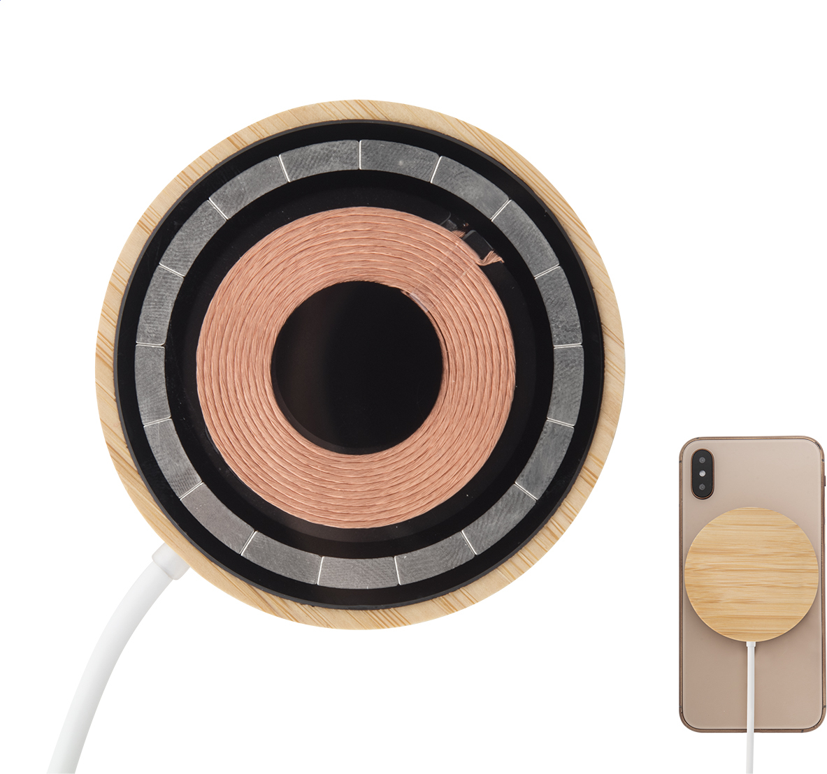 Magnetická bezdrátová rychlonabíječka (15W) v bambusovém a průhledném plastovém krytu s viditelnými elektronickými součástkami. Včetně samolepícího kovového kroužku pro použití magnetické funkce na jakémkoli bezdrátově nabíjecím zařízení. Kompatibilní s iPhone® 12 nebo novějším. Včetně USB-C nabíjecího kabelu.