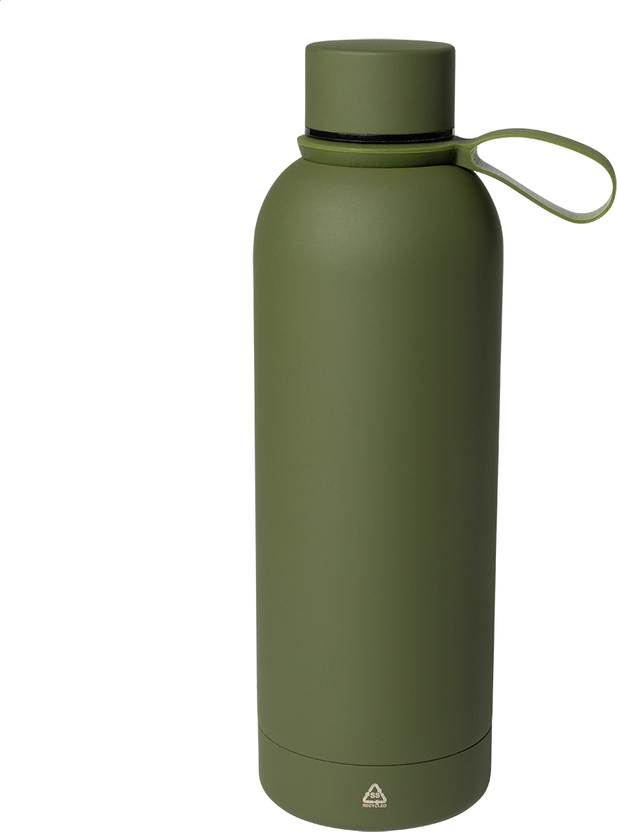 Dvoustěnná vakuová láhev z recyklované nerezové oceli s pogumovanou úpravou a silikonovým páskem, 500 ml.