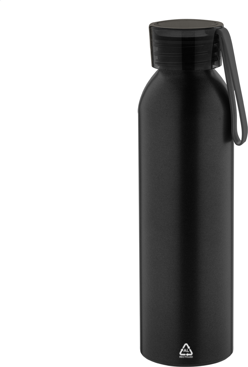 Láhev z recyklovaného hliníku s víčkem v odpovídající barvě a silikonovým popruhem, 600 ml.