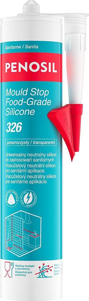 CHARAKTERISTIKAPENOSIL Silikon potravinářský stop plísni 326 je víceúčelový, neutrální silikon určený pro sanitární aplikace, dokončovací práce a těsnění ve ventilačních systémech.Vytváří vodotěsný a plísním odolný spoj na široké škále materiálů.Odolnost vůči plísním, UV záření a stárnutí.Nejvyšší hygienická třída: XS1.Odolnost vůči domácím chemikáliím.Nezpůsobuje korozi kovů.Nestéká - vhodné pro aplikaci na svislé povrchy.Perfektní aplikace a pohodlné použití.BARVATransparentní.POUŽITÍDokončovací práce, utěsnění sanitárních a větracích systémů.Výplň, utěsnění a glazování zevnitř i zvenku.Těsnění spár mezi podlahovými a obkladovými dlaždicemi, umyvadly, toaletami, vanami, bateriemi a sprchovými kouty.Tmelení a utěsňování spár kolem okenních a dveřních rámů.Přilne na: beton, cihly, zdi, dřevo, hliník (lakovaný, eloxovaný, natřený), pozinkovanou ocel, sklo, keramiku, PVC i většinu plastů.APLIKAČNÍ POSTUPOdřízněte špičku kartuše.Našroubujte aplikační trysku a vyřízněte otvor pod úhlem 45° tak, aby byl o něco větší než utěsňovaná mezera.Vložte kartuši do pistole na tmel a naneste hmotu, přičemž udržujte rovnoměrný tlak na spoušti pistole a plynule pohybujte tryskou podél mezery.Odstraňte přebytečný tmel a povrch vyhlaďte vhodným nástrojem.OMEZENÍNepoužívejte na bitumenové podklady ani na stavební materiály, které mohou uvolňovat oleje, změkčovadla nebo rozpouštědla (např. přírodní kaučuk, chloropren, EPDM).Nelepí na polyethylen (PE), polypropylen (PP) ani PTFE (Teflon®).Nepoužívejte při teplotách pod +5 °C.Nedoporučuje se pro utěsnění povrchů z přírodního kamene, jako je mramor a žula.Nepoužívejte jako lepidlo na zrcadla.PŘÍPRAVA POVRCHUPovrchy určené k utěsnění musí být čisté, suché a zbavené prachu, uvolněných částic, oleje a zbytků starého tmelu.Neporézní povrchy by měly být čištěny rozpouštědlem a čistým bavlněným hadříkem, který nepouští vlákna.Přebytečné rozpouštědlo odstraňte suchým hadříkem.Odřízněte špičku kartuše.Našroubujte aplikační trysku a vyřízněte otvor pod úhlem 45° tak, aby byl o něco větší než utěsňovaný spoj.Vložte kartuši do pistole na tmel a nanášejte tmel, přičemž udržujte rovnoměrný tlak na spoušti pistole a plynule pohybujte tryskou podél spáry.Odstraňte přebytečný tmel a povrch vyhlaďte vhodným nástrojem.V případě potřeby chraňte přilehlé povrchy maskovací páskou.U širokých mezer použijte dilatační spáru, abyste zajistili správnou tloušťku a tvar spáry.Zajistěte dostatečné větrání na pracovišti.Během vytvrzování dbejte na to, aby utěsněné povrchy zůstaly čisté a nebyly vystaveny mechanickému namáhání.Vzhledem k rozmanitosti stavebních materiálů se doporučuje provést předběžný test kompatibility.Teplota aplikace: od +5 °C do +40 °C.ČISTĚNÍNevytvrzený produkt lze odstranit rozpouštědlem.Vytvrzený produkt lze mechanicky odstranit a poté otřít vlhkým hadříkem.SKLADOVÁNÍGarantovaná trvanlivost je 12 měsíců od data výroby za předpokladu, že je skladováno v uzavřeném, originálním obalu, na suchém místě, chráněném před přímým slunečním zářením, při teplotě mezi +5 °C a +30 °C.BEZPEČNOSTNÍ POŽADAVKYBěhem aplikace zajistěte dostatečné větrání a používejte nezbytné osobní ochranné prostředky.Podrobnější bezpečnostní informace naleznete v bezpečnostním listu (SDS).
