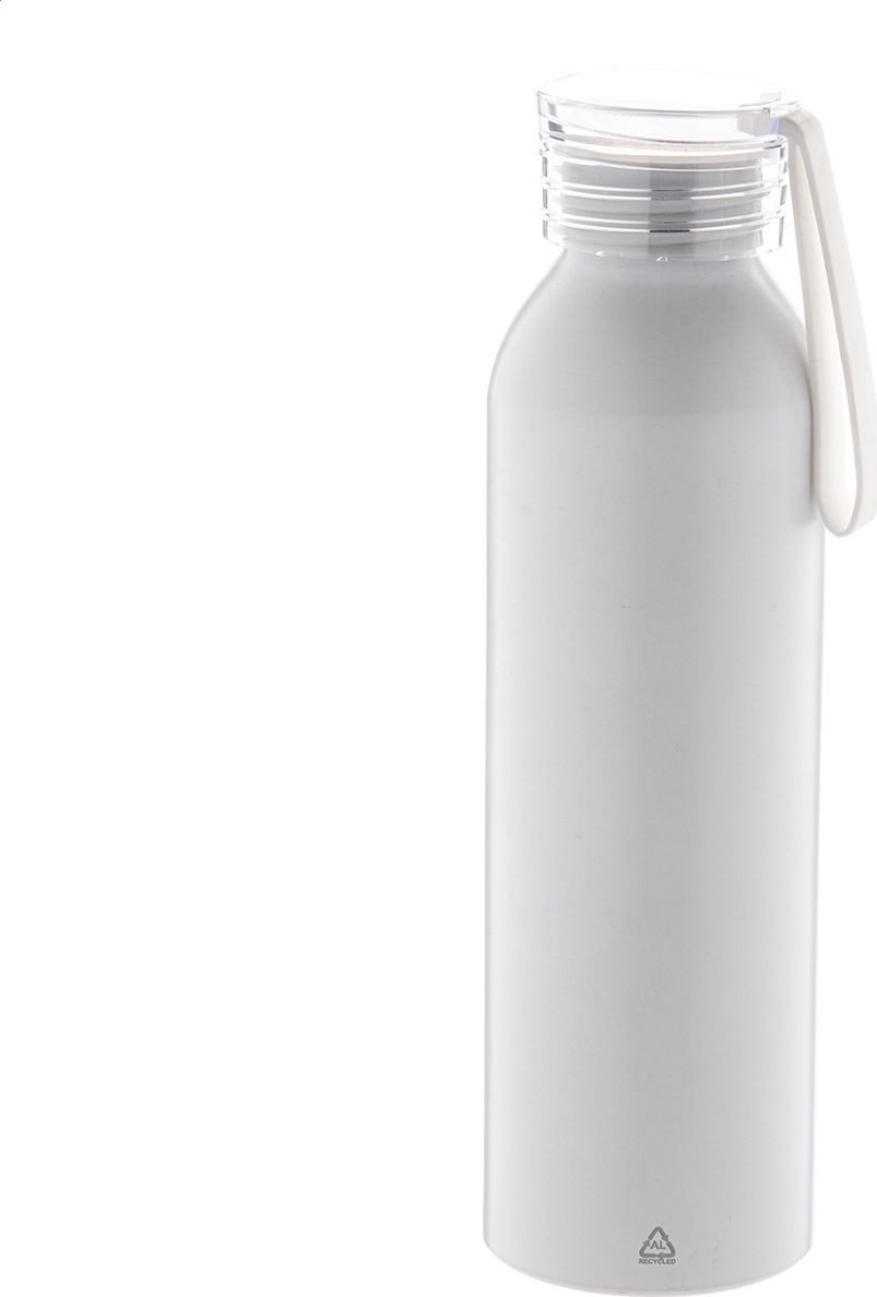 Láhev z recyklovaného hliníku s víčkem v odpovídající barvě a silikonovým popruhem, 600 ml.