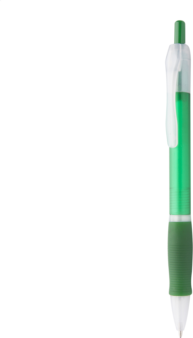 Plastové kuličkové pero s pogumovaným gripem a s modrou náplní.
