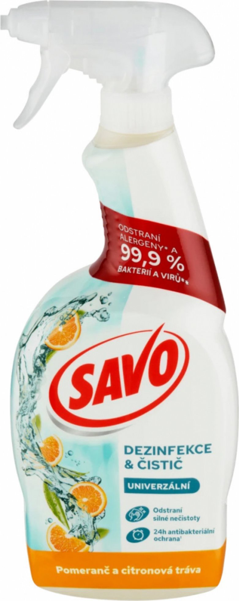 Savo Víceúčelový sprej. Tekutý čisticí a dezinfekční přípravek ve spreji bez chloru je vhodný na omyvatelné povrchy v celé domácnosti. Přípravek příjemně voní. Jeho bezoplachové složení čistí a zároveň dezinfikuje různé povrchy v koupelně a kuchyni. Přípravek je vhodný i na kovové povrchy. Zároveň pomáhá odstraňovat alergeny (způsobené prachem, pylem, přítomností psa nebo kočky). Použití:Nastříkejte rovnoměrně na čištěný povrch a setřete vlhkým hadříkem. Pro zajištění antibakteriálního účinku nechte působit 5 minut. V případě silného znečištění nechte působit 15 minut. Nepoužívejte na mramor. Nepoužívejte společně s jinými výrobky. Pokud jste na povrch použili jiný přípravek, opláchněte jej, než použijete tento přípravek. Odstraňte obal v souladu s platnou legislativou, umístěte prázdný obal do komunálního odpadu. Upozornění:Používejte biocidní přípravky bezpečným způsobem. Před použitím si vždy přečtěte označení a informace o přípravku. Bezpečnostní upozornění GHS07 - dráždivé látky Obsah nebezpečných látek EUH208 Obsahuje 1,2-benzisothiazol-3(2H)-on. Může vyvolat alergickou reakci. EUH208 Obsahuje (viz nebezpečné látky). Může vyvolat alergickou reakci. H315 Dráždí kůži. H319 Způsobuje vážné podráždění očí. P102 Uchovávejte mimo dosah dětí. P302+P352 PŘI STYKU S KŮŽÍ: Omyjte velkým množstvím vody a mýdla P305+P351+P338 PŘI ZASAŽENÍ OČÍ: Několik minut opatrně vyplachujte vodou. Vyjměte kontaktní čočky, jsou-li nasazeny a pokud je lze vyjmout snadno. Pokračujte ve vyplachování. P332+P313 Při podráždění kůže: Vyhledejte lékařskou pomoc/ošetření. P337+P313 Přetrvává-li podráždění očí: Vyhledejte lékařskou pomoc/ošetření. P501 Odstraňte obsah/obal dle instrukcí na výrobku. Savo Dezinfekce víceúčelový sprej intenzivně likviduje 99,9 % bakterií a odstraňuje alergeny způsobené prachem, pylem, přítomností domácích zvířat. Savo je vhodné i na kovové povrchy. Vaše podlaha i další omyté povrchy budou zářit čistotou a váš domov provoní příjemným aromatem. Vše bude hygienicky čisté a svěží. Příprava a použití PoužitíNastříkejte rovnoměrně na čištěný povrch a setřete vlhkým hadříkem. Pro zajištění antibakteriálního účinku nechte působit 5 minut. V případě silného znečištění nechte působit 15 minut. Bezpečnostní varování Odstraňte obal v souladu s platnou legislativou, umístěte prázdný obal do komunálního odpadu.