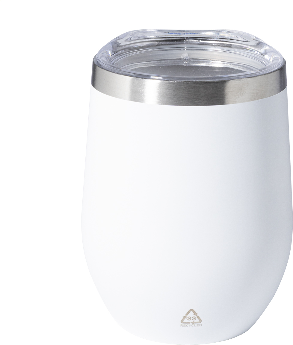 Dvoustěnný termo hrnek z recyklované nerezové oceli s plastovým víčkem na pití. 350 ml.