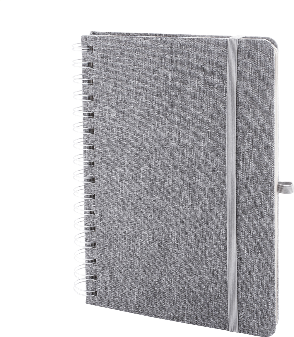 Spirálový blok A5 s deskami potaženými polyesterem RPET s plastovým držákem na mobil a tablet z pšeničné slámy. Se 70 linkovanými listy z recyklovaného kraftového papíru, gumičkou a držákem na pero.