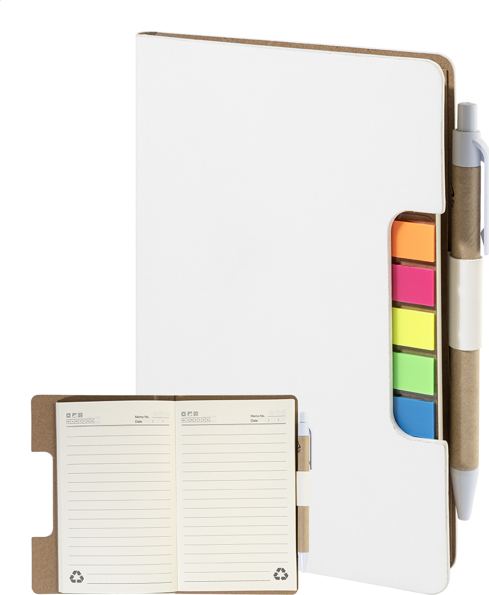 Blok s recyklovanou PU kůží, 70 linkovanými listy z recyklovaného papíru a 125 značkovači stránek (v 5 různých barvách). Včetně recyklovaného papíru a kuličkového pera z recyklovaného PP s modrou náplní.
