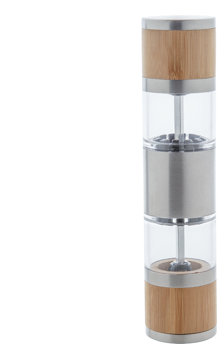 Oboustranný manuální mlýnek na sůl a pepř, nerez ocel/bambus, s keramickým mlýnkem.