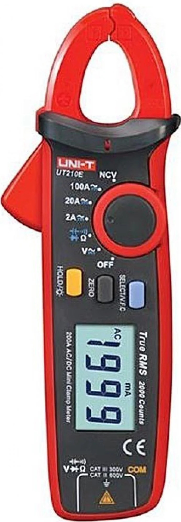 UNI-T UT210E - kompaktní klešťový multimetr* TRMS* automatické nastavování rozsahů* jemný rozsah pro měření menších proudů* funkce bezkontaktní detekce napětí* malé rozměrySPECIFIKACEStřídavý (AC) proud2A/20A/100Apřesnost ±(2.5%+5)Stejnosměrný (DC) proud2A/20A/100Apřesnost ±(2.5%+3)Střídavé (AC) napětí2V/20V/200V/600Vpřesnost ±(1%+3)Stejnosměrné (DC) napětípřesnost ±(0.7%+3)Odpor200?/2k?/20k?/200k?/2M?/20M?přesnost ±(1%+2)Kapacita2nF/20nF/200nF/2µF/20µF/200µF/2mF/20mFpřesnost ±(4%+5)FUNKCEMax. údaj displeje 2000Automatické nastavování rozsahůPrůměr kleští 17mmTRMSTest diodNCVData HoldZero módPodsvětlení displejeAutomatické vypnutíProzváněníIndikace slabé baterieOchrana vstupůVstupní impedance pro DCV 10M?+OBECNA CHARAKTERISTIKANapájení: 2x1,5V baterie AAAHmotnost: 170gRozměry: 175x60x33mmRozměry LCD: 39x26mm