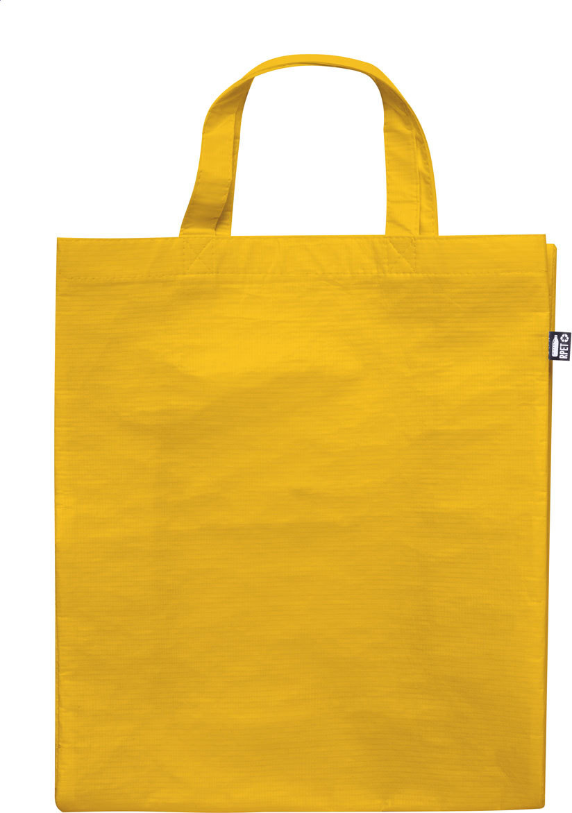 Nákupní taška z polaminovaného polyesteru RPET s klínem a krátkými uchy, 110 g/m². S výrazným štítkem RPET.
