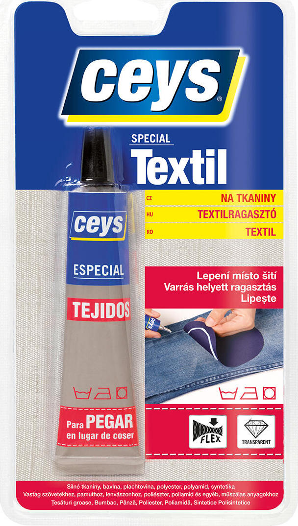 POPISLepené materiály je možné PRÁT A ŽEHLIT. Lepidlo zajistí PRUŽNÉ spojení bez šití. Po zaschnutí je transparentní.VLASTNOSTIPružné.Po zaschnutí je transparentní.Odolné vůči praní a žehlení.APLIKACEZcela jednoduchá oprava, zdobení, kreativní tvoření a scrapování.RUČNÍ PRÁCE s textilem.Výroba KOSTÝMŮ.Lepení záplat na kalhoty.RUČNÍ PRÁCE: náhrdelníky, náramky atd.LEMOVÁNÍ: záclony, závěsy atd.MATERIÁLYVšechny typy přírodních a syntetických látek, mezi sebou nebo na jiné materiály: dřevo, kůže, kov, karton, keramika, sklo atd.Silné tkaniny a bavlněné tkaniny, polyester-bavlna, filcVýše uvedené údaje se týkají pevných tkanin se stálým barvivem. V každém případě se vzhledem k odlišnostem gramáže, směsi vláken a barviv aplikovaných na textil doporučuje provést vždy zkoušku lepení na neviditelné části a vyzkoušet, zda lepidlo neprosakuje nebo nešpiní danou tkaninu. Tento přípravek není vhodný pro textilie citlivé na vodu.ZPŮSOB POUŽITÍDůkladně OČISTĚTE a OSUŠTE lepené plochy.APLIKUJTE tenkou a jednotnou vrstvu lepidla Ceys special textil na lepenou látku.SPOJTE obě plochy přitlačením po dobu několika minut. Doporučujeme prodloužit dobu přitlačení na jednu hodinu pomocí lepicí pásky nebo nějakého těžkého předmětu, aby byl spoj zcela pevný.Odstraňte přebytek lepidla hadříkem navlhčeným ve vodě.Maximální pevnosti je dosaženo po uplynutí 24 hodin od aplikace.SKLADOVÁNÍVýrobek skladujte v původním uzavřeném obalu v suchu a chladnu při teplotě v rozmezí 5 - 25 °C.