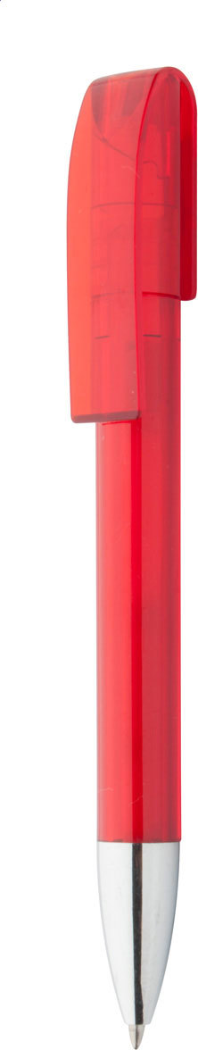 Plastové kuličkové transparentní barevné pero s chromovou špičkou a s modrou náplní.