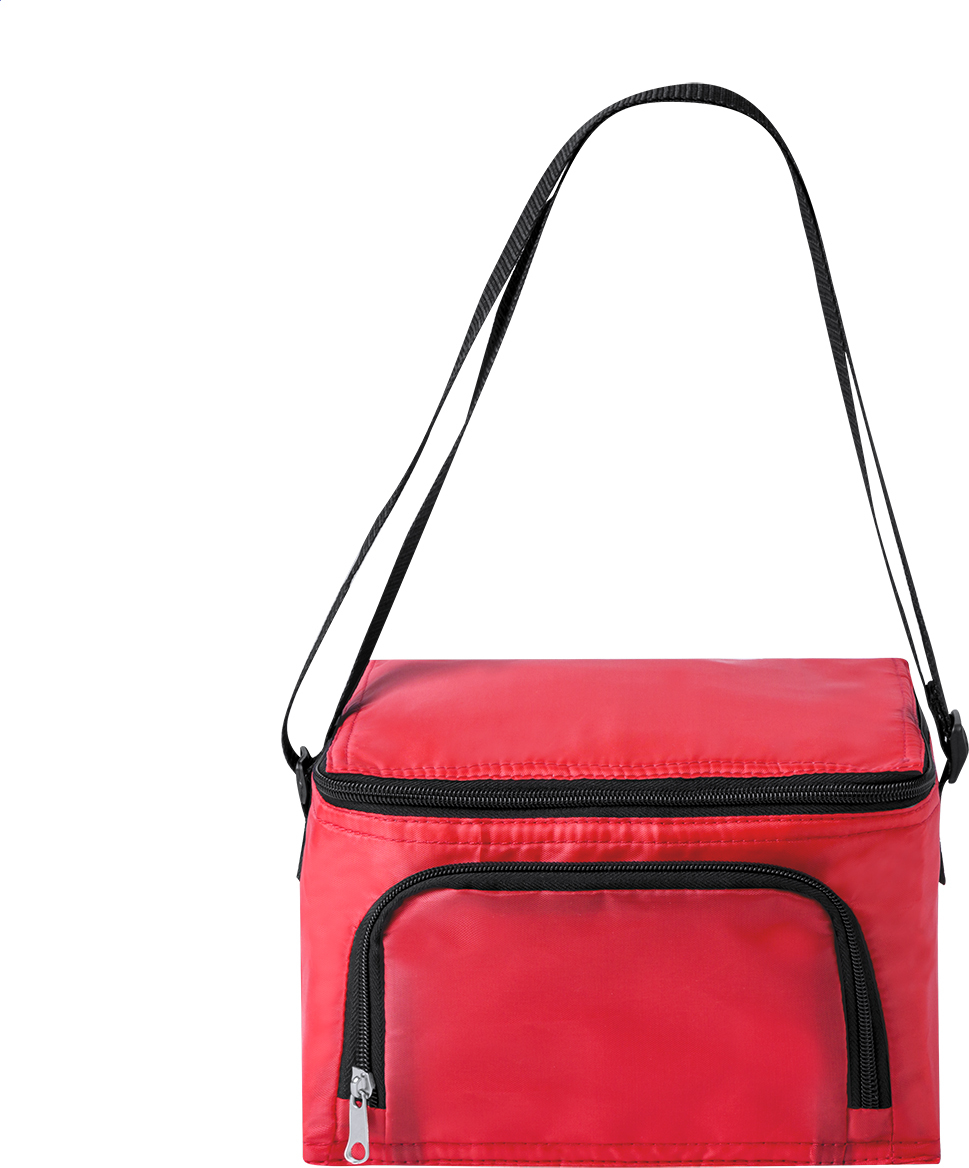 Polyesterová chladicí taška s přihrádkami na zip, hliníkovým polstrováním a ramenním popruhem. Pro 6 ks plechovek 0,33L. 210D polyester.