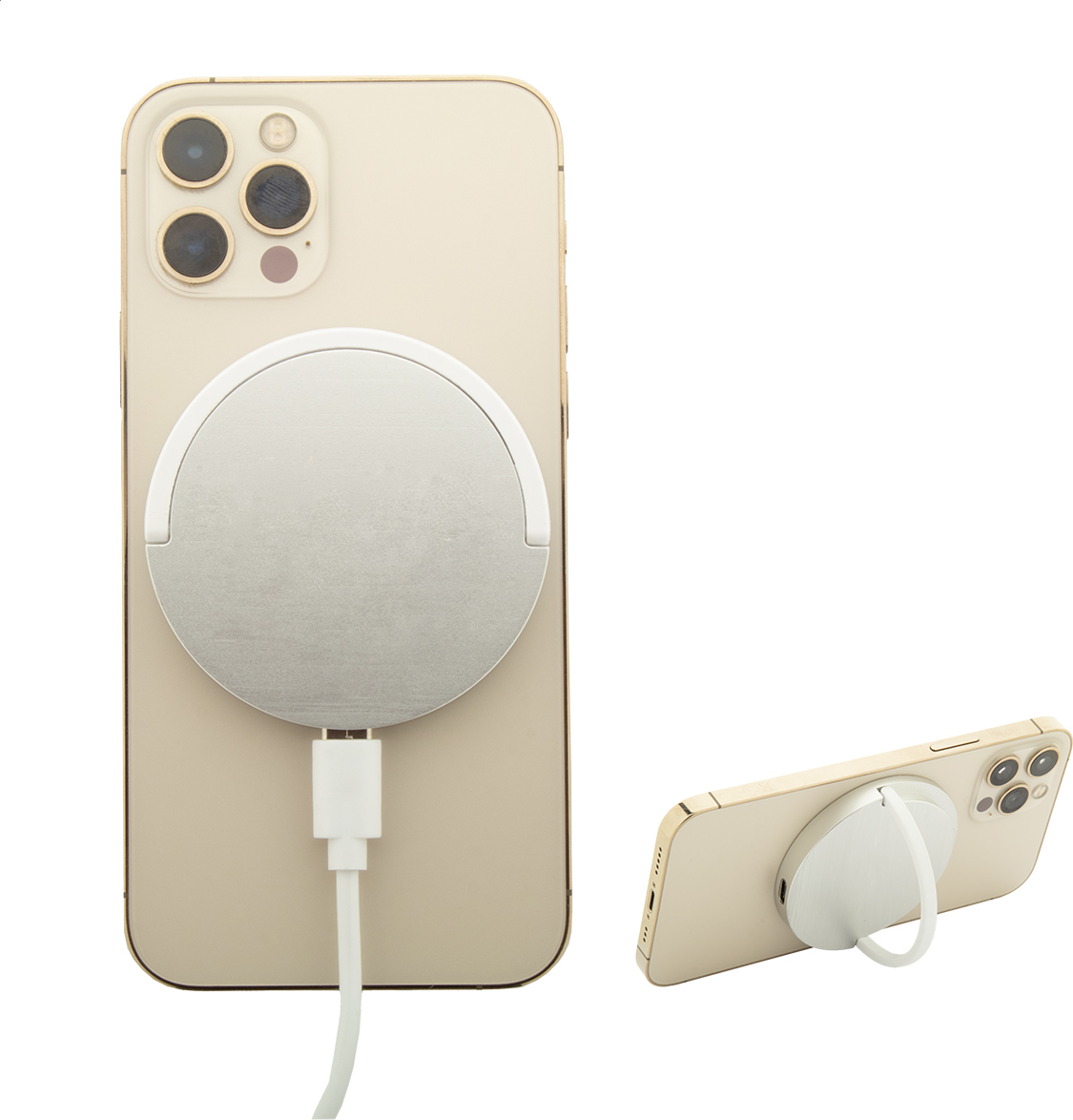 Magnetická bezdrátová rychlonabíječka (15W) s kroužkem držáku na mobil z recyklovaného hliníku a pouzdrem z recyklovaného ABS plastu. Kompatibilní s iPhone® 12 nebo novějším. Včetně USB-C nabíjecího kabelu.