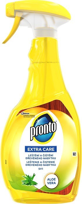 Pronto Aloe Vera čistič 5v1 rozprašovač - čistí dřevo- odstraňuje prach- oživuje- odstraňuje až 90% alergenů- čistí šmouhy a otisky Odstraňuje všechy prachové alergeny včetně zvířecích. Pronto Aloe Vera čistič 5v1 rozprašovač šetrně čistí dřevěné povrchy a zlepšuje jejich přirozenou krásu. Návod pro použití: otočte trysku do pozice On. Nastříkejte přípravek na znečištěný povrch a vyčistěte ho měkkou tkaninou nebo papírem. Doporučuje se otestovat účinek přípravku na malém skrytém místě. Nepoužívejte na kůži, dřevo bez povrchové úpravy, mramor a žulu. Nemíchejte s jinými čističi. Upozornění: Uchovávejte mimo dosah dětí. Nevdechujte aerosoly. Při zasažení očí okamžitě důkladně vypláchněte vodou a vyhledejte lékařskou pomoc. Používejte pouze v dobře větraných prostorách. Zamezte styku s kůží a očima. Po použití si umyjte ruce. Při styku s kůží omyjte postižené místo vodou. Prázdné obaly zneškodňujte v rámci tříděného odpadu v souladu se zákonem o odpadech. Složení: parfémy, Quaternium-15, Linalool.