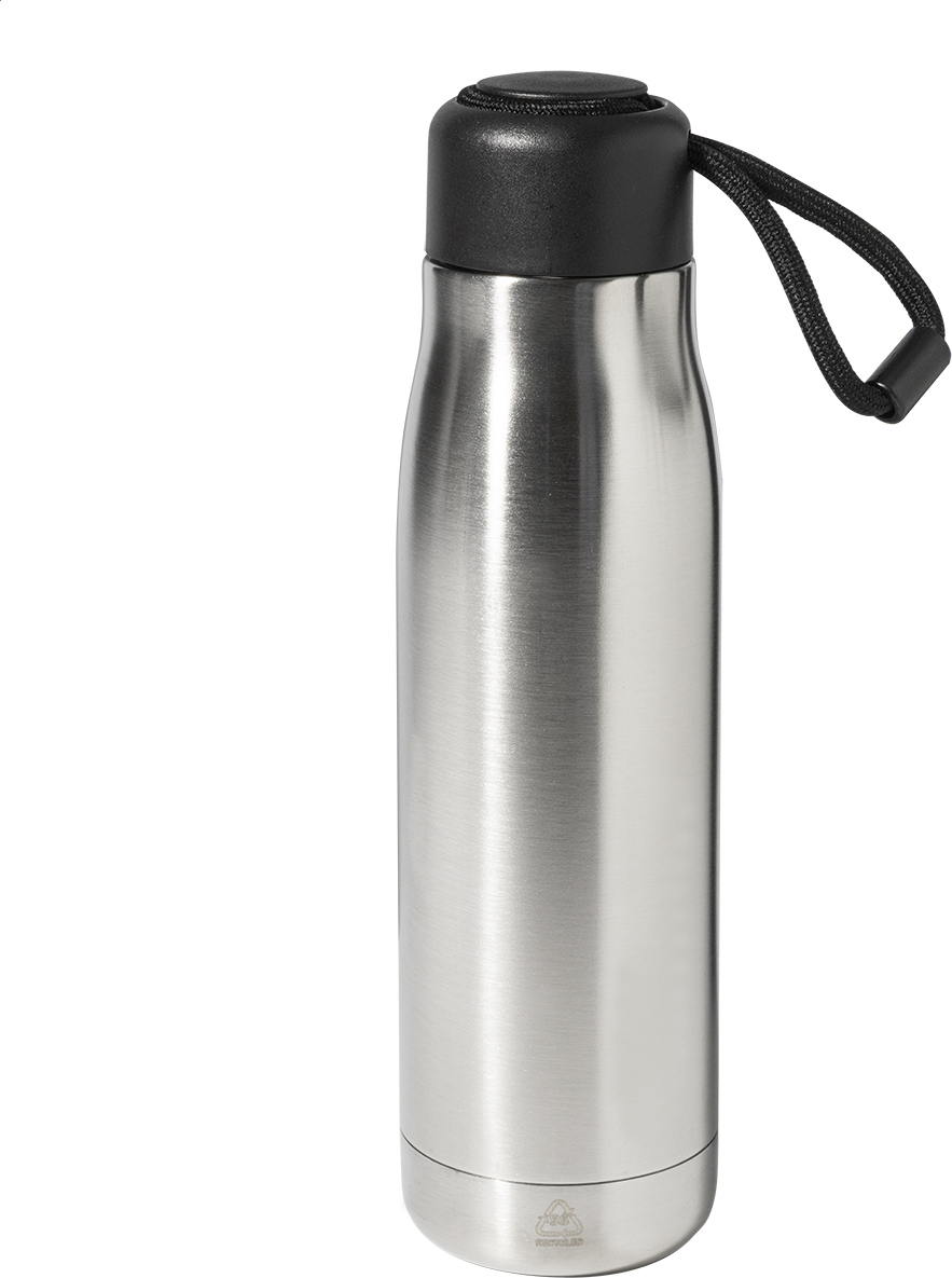 Dvoustěnná, vakuově izolovaná láhev z recyklované nerezové oceli s PP víčkem a integrovaným poutkem na nošení se šňůrkou. 500 ml.