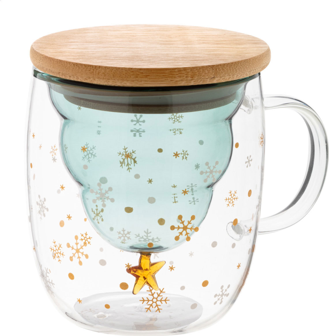 Dvoustěnný hrnek z borosilikátového skla s bambusovým víčkem, vzorem sněhových vloček a obráceným vánočním stromečkem uvnitř, 200 ml. V kraftové papírové krabičce.