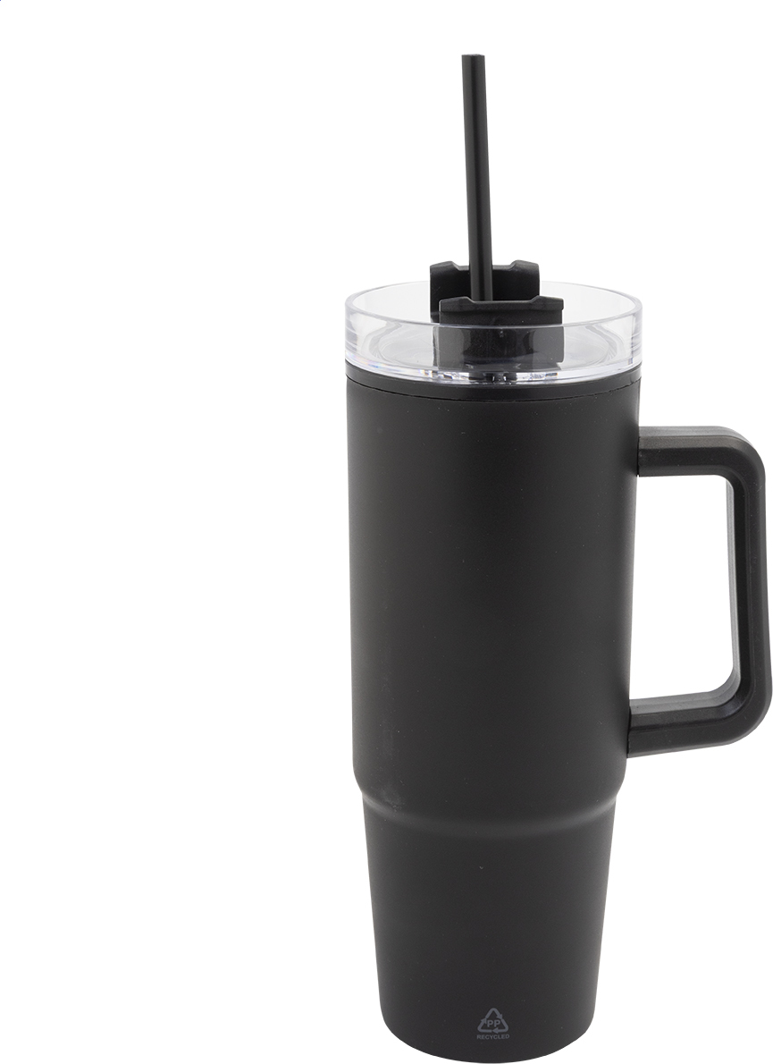 Dvoustěnný termo hrnek z recyklovaného PP plastu s plastovým víčkem na pití a brčkem. 900 ml.