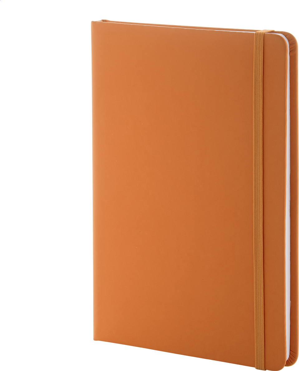 Blok A5 z recyklované PU kůže se 100 čistými listy z recyklovaného papíru. Se záložkou v odpovídající barvě a gumičkou.