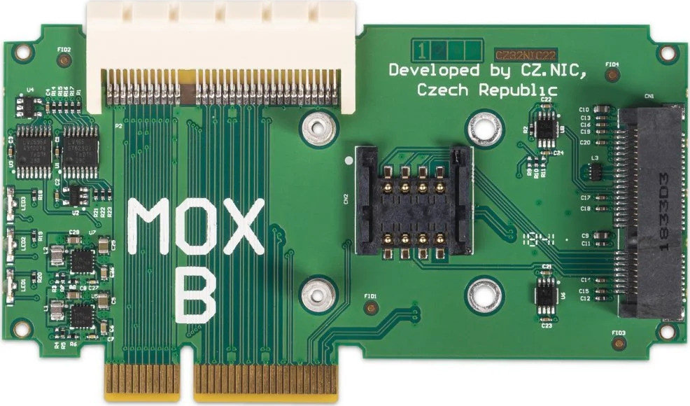 MOX B umožňuje vaši sestavu rozšířit o další hardware. Naleznete na něm mPCIe slot pro kompatibilní Wi-Fi kartu, řadič disků či LTE modem. Pokud se rozhodnete použít LTE modem, bude se vám hodit slot na SIM kartu, kterým je MOX B také vybaven. Uživatelům Wi-Fi sítí doporučujeme originální MOX Wi-Fi add-on (mPCIe), díky němuž mohou očekávat výrazně vyšší rychlost než u SDIO Wi-Fi.KompatibilitaMOX B může být v sestavě pouze jednou, PCIe sběrnice je v něm ukončena. MOX B z toho důvodu nelze použít ani současně s MOX F. Pokud chcete modul se stejnými parametry, ale průchozím PCIe signálem, zvolte MOX G.Tento modul slouží pouze jako rozšíření k alespoň základní sestavě MOX Start. Je součástí sestav MOX Power Wi-Fi a MOX Classic. Při kombinaci s dalšími moduly dbejte na zachování kompatibility. Správné pořadí jednotlivých modulů a průchodnost signálu PCIe a SGMII si ověřte v konfigurátoru na mox-configurator.turris.cz.Obsah baleníTurris MOX B modul - deskaKrabička na desku