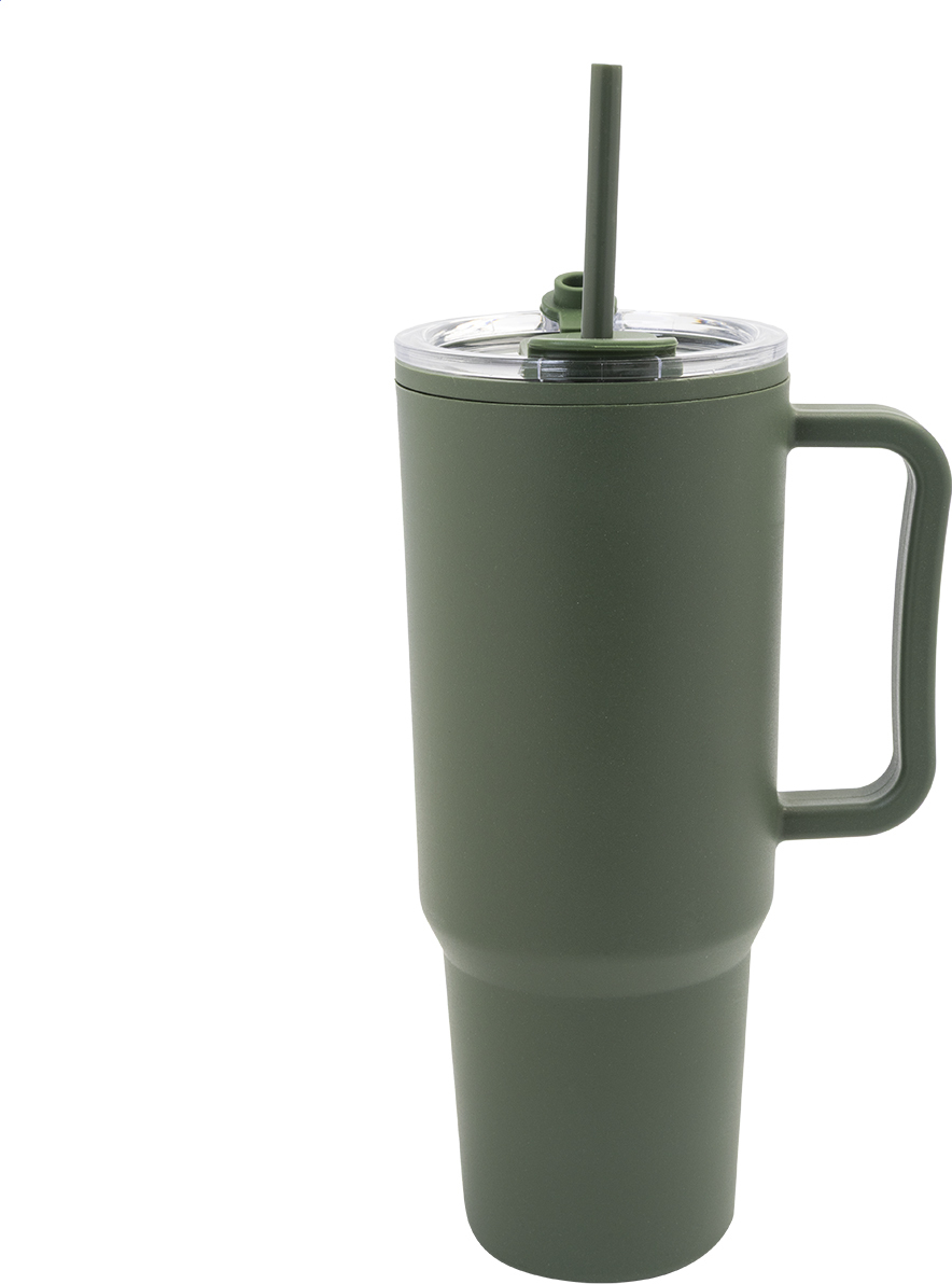 Dvoustěnný termo hrnek izolovaný PP plastem s víčkem na pití a brčkem. 1100 ml.