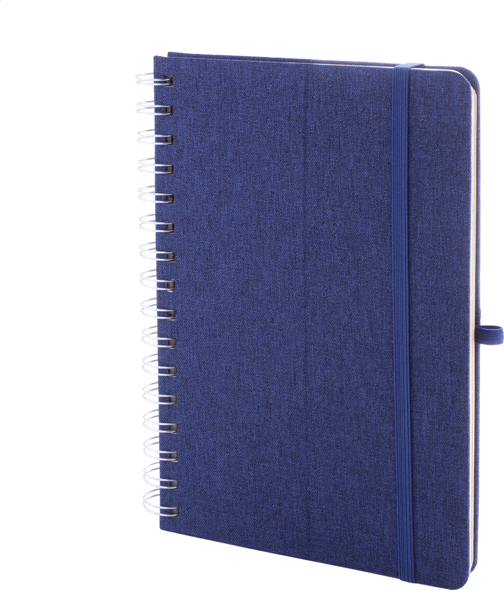 Spirálový blok A5 s deskami potaženými polyesterem RPET s plastovým držákem na mobil a tablet z pšeničné slámy. Se 70 linkovanými listy z recyklovaného kraftového papíru, gumičkou a držákem na pero.