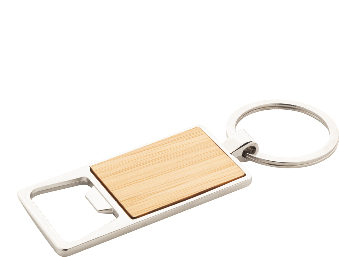 Kovový přívěsek na klíče s bambusovou vložkou a otvírákem na láhve.