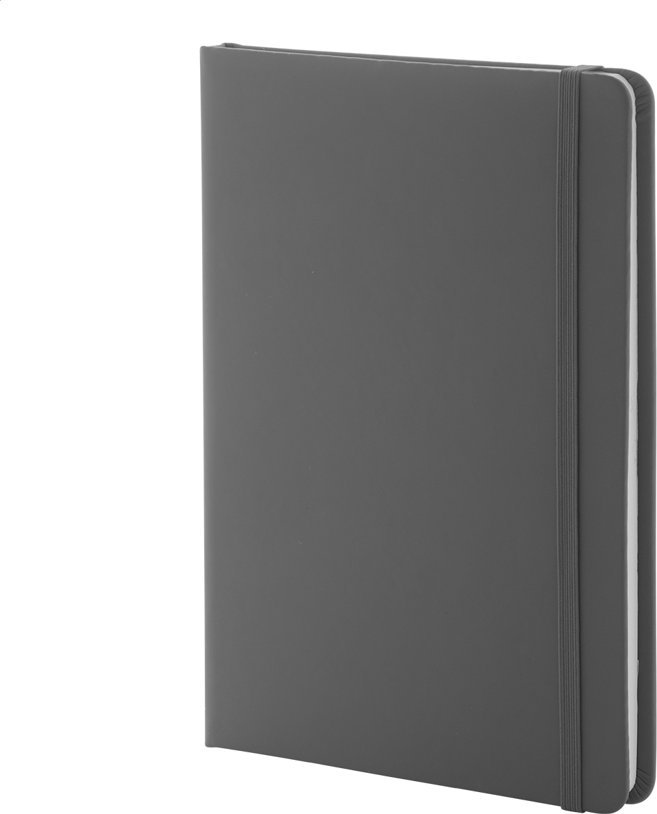 Blok potažený recyklovanou PU kůží se 100 linkovanými listy z recyklovaného papíru. Se záložkou v odpovídající barvě a gumičkou. Velikost A5.