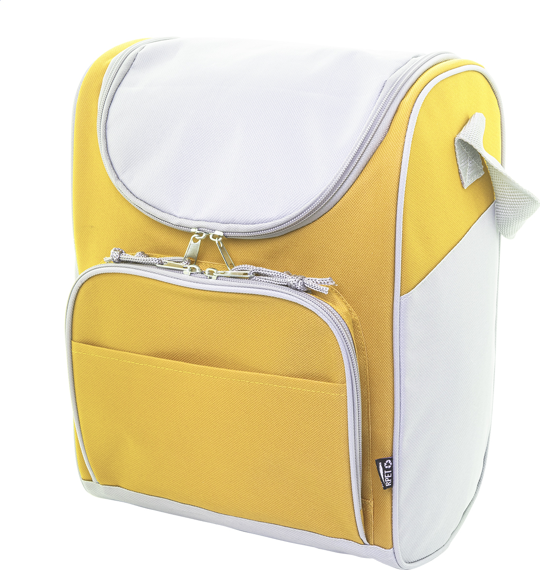 Chladicí taška RPET s hliníkovým polstrováním. Se 2 přihrádkami na zip, malou přední kapsou a nastavitelným ramenním popruhem. 600D RPET polyester s výrazným štítkem RPET.