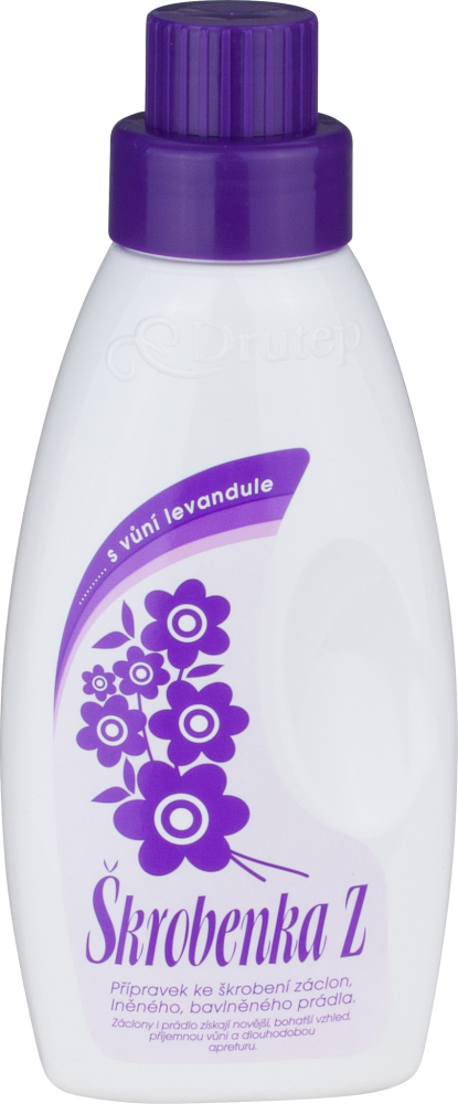 Tekutý přípravek ke škrobení záclon, lněného a bavlněného prádla. Tradiční český výrobek, který používaly již naše maminky. Škrobenka Z je syntetický přípravek ke škrobení záclon, lněného a bavlněného prádla. Záclony i prádlo získají novější, bohatší vzhled, příjemnou vůni a dlouhodobou apreturu. Používá se pro škrobení ruční i v automatických pračkách. Použití Drutep Škrobenka Z tekutý škrob s vůní levandule: Při praní v automatické pračce dávkujte na jednu standardní náplň pračky (4-5 kg prádla) podle potřeby 2-4 uzávěry (40-80g) do poslední máchací lázně. Pro ruční škrobení dávkujte 4-6 uzávěry (80-120g) na 10l vody. Záclony sušte vyrovnané! Nevařte! Chraňte před mrazem! Před použitím zatřepejte! Složení Drutep Škrobenka Z: 5 - 15 % Polymer vinylacetátu <5% stabilizátor. Parfém (Amyl Cinnamal, Citral, Coumarin, Hydroxycitronellal, Limonene, Linaool, Butylphenyl Methylpropional), Konzervant (Dimethylol Glycol, Dimethylol Urea, Methylchloroisothiazolinone, Methylisothiazolinone).