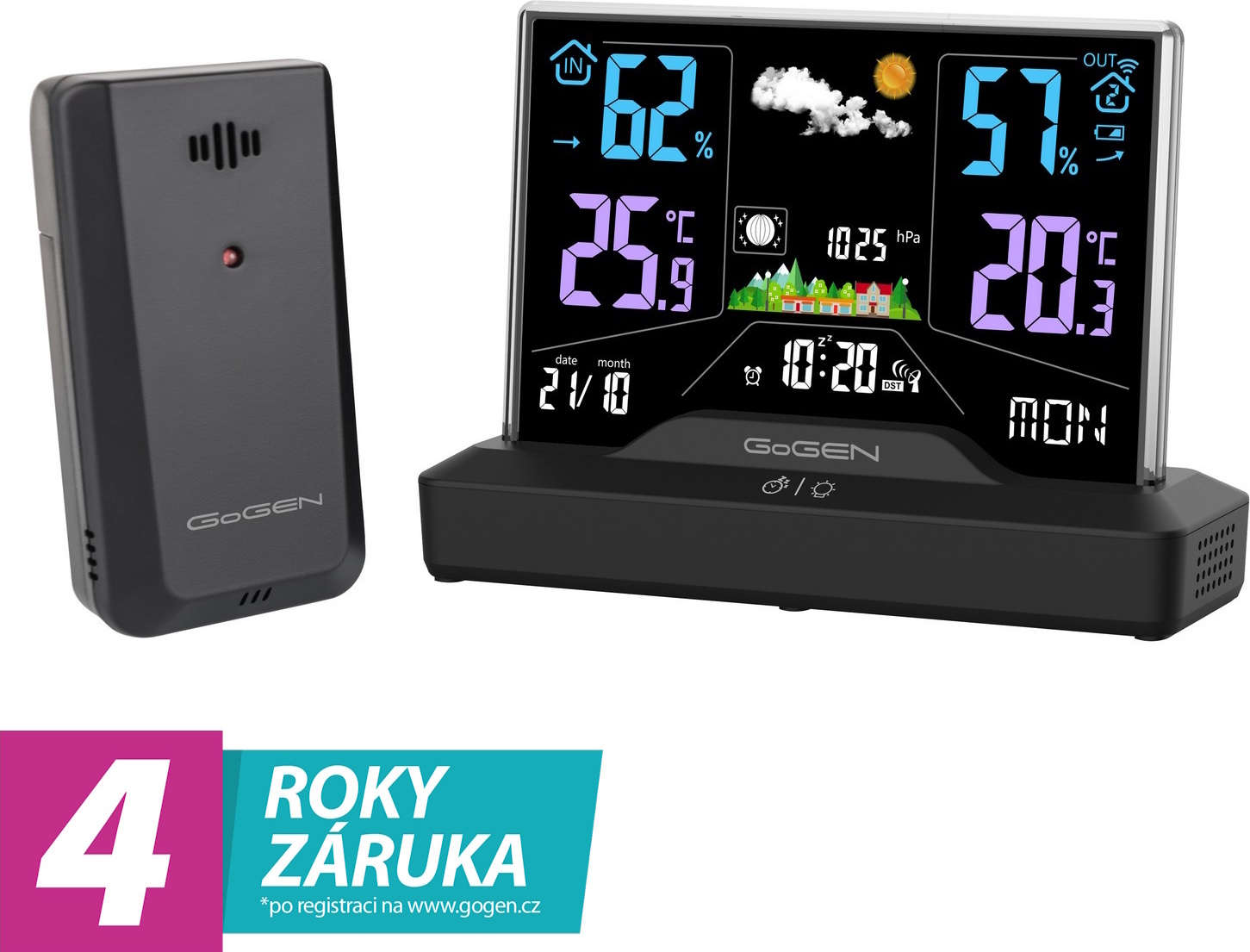 Prodloužená záruka na 4 rokyNa meteostanici GoGEN ME 2000 získáte nadstandardní 4letou záruku. Stačí jednoduše zaregistrovat svůj výrobek na oficiálních stránkách značky GoGEN na adrese ZDE.Spolehlivý přehled o počasí S meteostanicí GoGEN ME 2000 získáte důležité informace o počasí i vnitřním prostředí – nabízí animovanou předpověď, měření teploty a vlhkosti uvnitř i venku, zobrazuje fáze Měsíce a barometrický tlak. Na přehledném displeji vidíte také minimální a maximální hodnoty a díky možnosti připojení až tří externích senzorů získáte přesná data z více míst. O čas se stará rádiový signál DCF 77, meteostanice navíc obsahuje budík a kalendář, takže se uplatní v každé domácnosti.Sledujte vývoj počasí s předstihemIntegrovaný barometr zaznamenává změny atmosférického tlaku a pomůže vám tak lépe odhadnout, kdy očekávat změnu počasí, přicházející déšť, vítr nebo pokles teploty.Měření podmínek v interiéru i venkuMeteostanice je kompatibilní s externími senzory GoGEN GOGMESENZOR15, které můžete umístit na různá místa v domácnosti – do garáže, zimní zahrady, sklepa nebo na balkon.