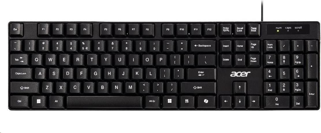 klávesnice Acer AKW100voděodolná* klávesa Copilot* výška zdvihu kláves 4 mm* Retail PackTechnické parametryRozvržení klávesnice: QWERTZ CZ/SKDélka kabelu: 1,8 mTechnologie kláves: membránováNumerická klávesnice: anoProgramovatelné klávesy: neLED kontrolky: Num Lock, Caps Lock, Scroll LockRozhraní: USB-A 2.0Barva: černáRozměry: 432x124x27,5mmHmotnost: cca 370gDoporučené požadavky na systém: volný port USB-A