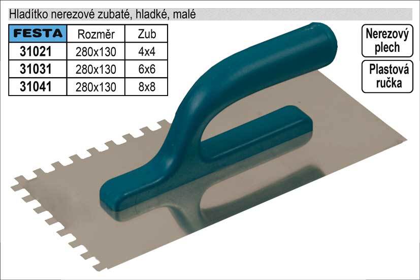 Hladítko nerezové zubové FESTA 280x130 mm, zub e4, s plastovou ručkou, tl.plechu 0,8 mm. Používá se zejména k nanášení lepidel pod obklady a dlažby, dále pak k nanášení stěrek, štuků, omítek, tmelů a dalších stavebních hmot. Hladítko nerezové zubové umožní natáhnout lepidlo či stavební hmotu v pruzích a výšce dle zubu hladítka.