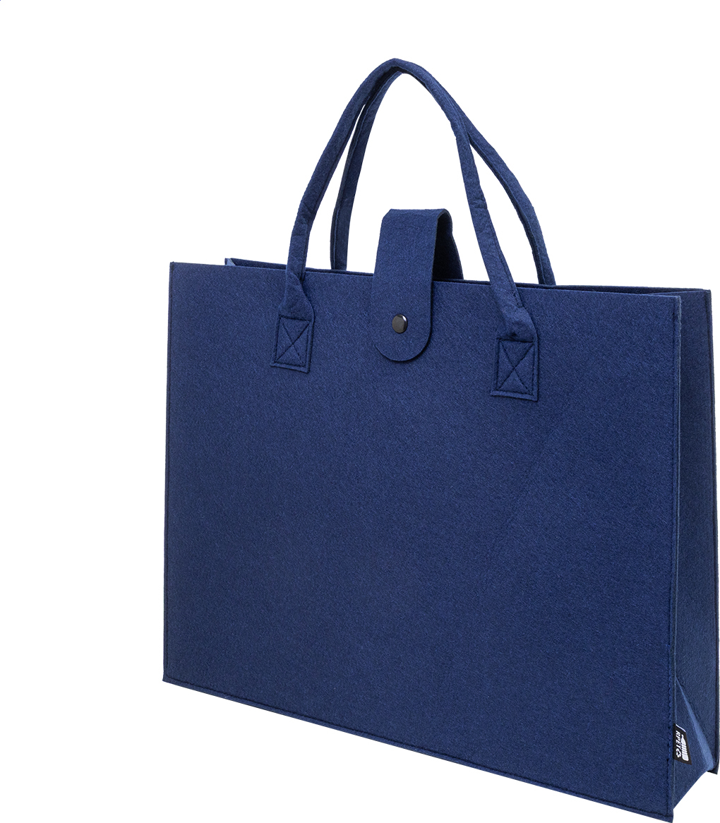 Nákupní taška z RPET plsti s klínkem, zapínáním na knoflíky a krátkými uchy. S výraznou etiketou z RPET.