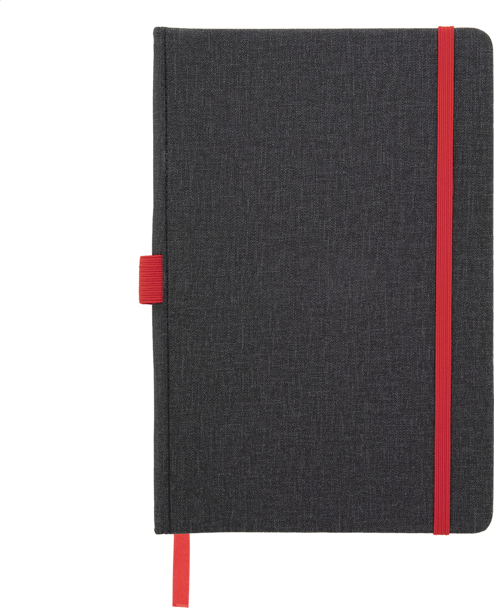 Texturovaný blok A5, potažený PU kůží se záložkou, gumičkou a držákem pera. 96 linkovaných listů.
