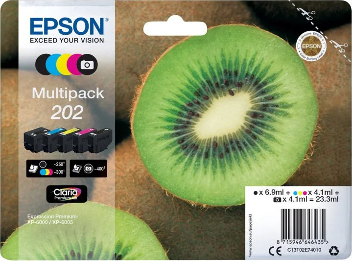 Vytiskněte vysoce kvalitní dokumenty i nádherné,lesklé fotografie. Inkoust Claria Premium je perfektní univerzální volbou a dokonalou rovnováhou pro moderní domácnost.Hlavní specifikacePopis výrobku Epson Multipack 202 - 5 barev - černá, žlutá, azurová, purpurová, foto černá - originál - inkoustová cartridgeTyp výrobku Inkoustová cartridgeTechnologie tisku TryskovýBarva tisku Černá,žlutá,azurová,purpurová,foto černáFunkce kazety Epson Claria Home InkTyp balení BlistrKompatibilní s Expression Premium XP-6000,XP-6005,XP-6100,XP-6105